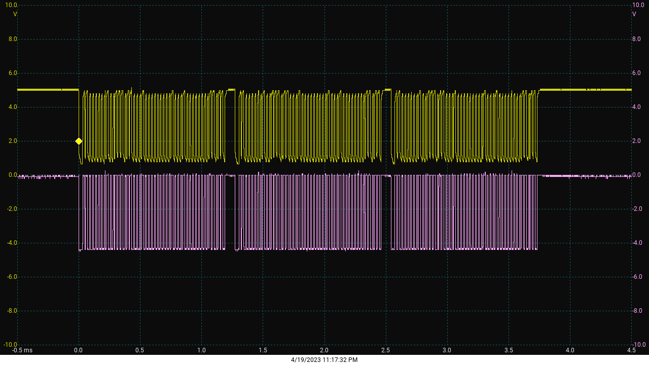 Yellow is SCP+ : The signal is held high and gets pulled low.