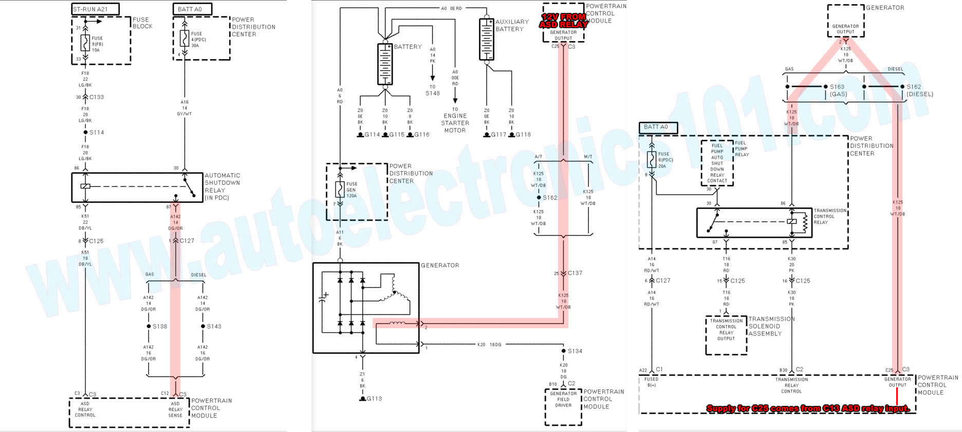 I will add more details on checking the ASD relay when I get a chance but for now I will leave you with the schematics. Keep in mind, for these trucks the pcm needs to see a crank signal from the CKP to actuate the ASD control signal from the PCM. So for basic testing check relay control signals and supplys to see where the problem is and go from there.